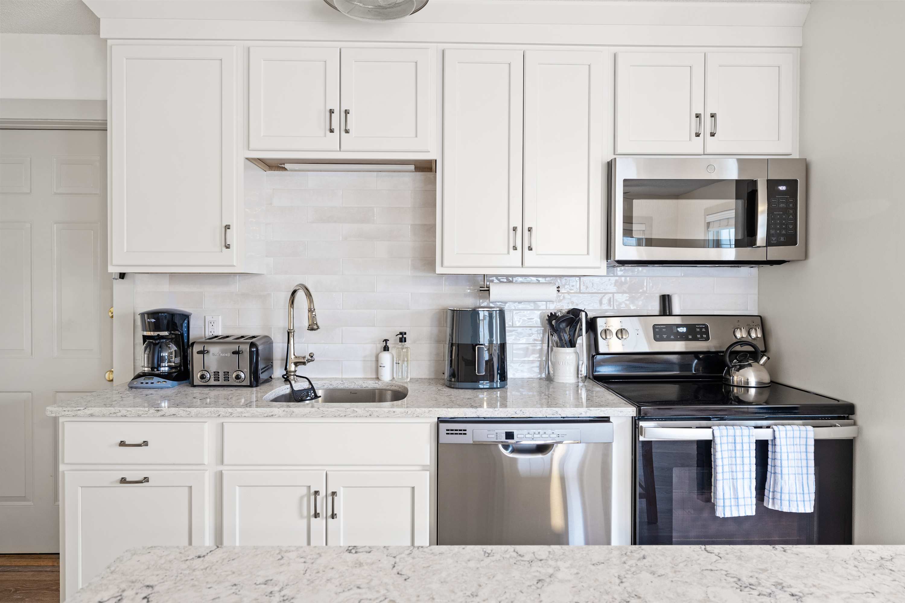 The fully equipped kitchen includes stainless steel appliances—refrigerator, oven, microwave, and dishwasher—along with the essentials for preparing meals or snacks. The dining area seats four, perfect for shared meals or planning your next adventure.