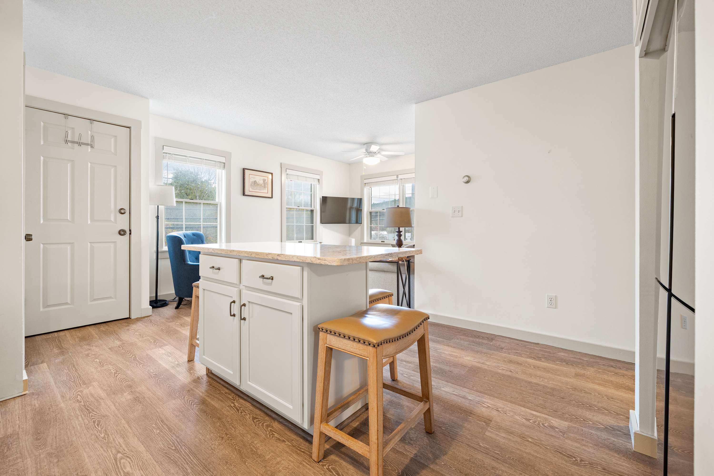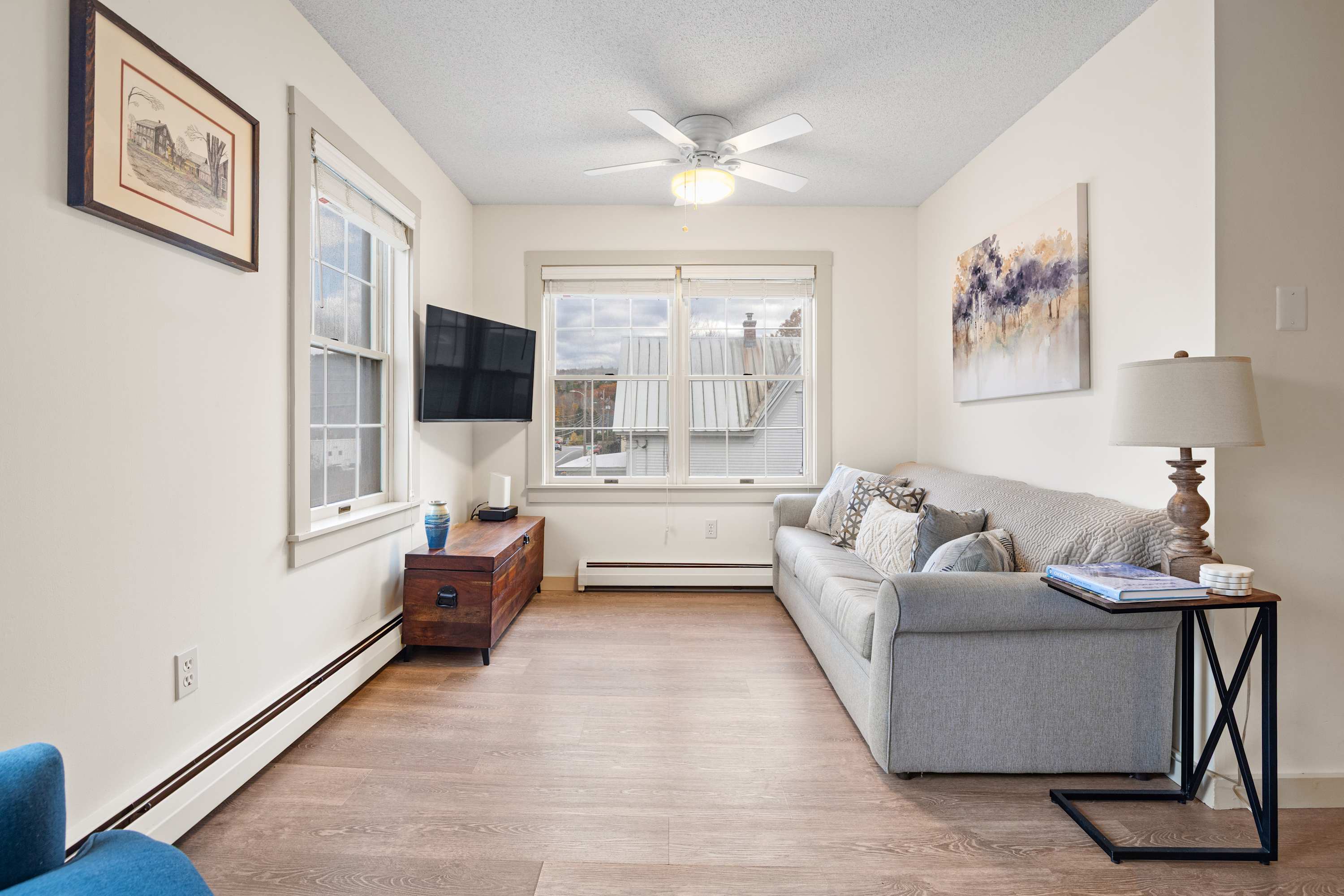 This bright and inviting 1BR condo offers everything you need for a relaxing stay near Okemo Mountain. The living area includes a comfortable sofa that converts into a pull-out bed, creating flexible sleeping options for small groups or families. Warm décor and soft lighting make it an ideal spot to relax after a day outdoors.