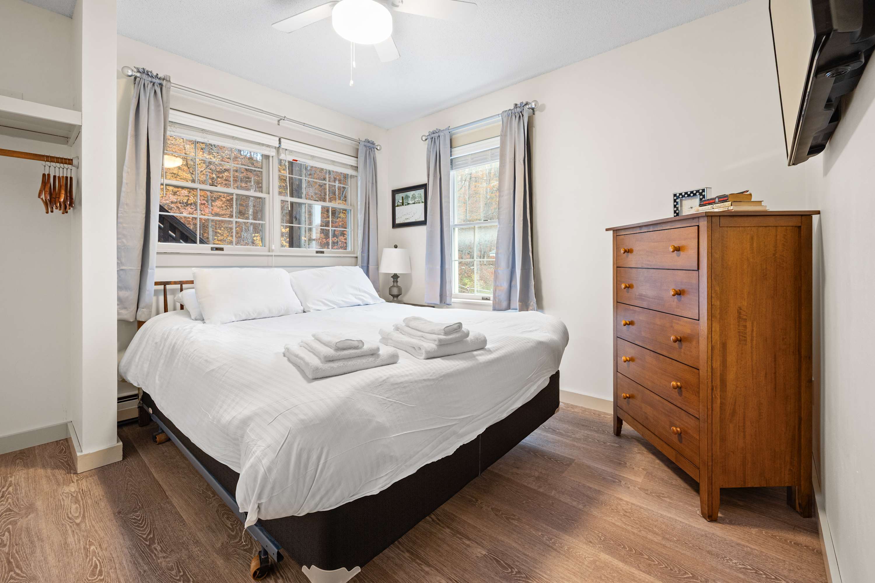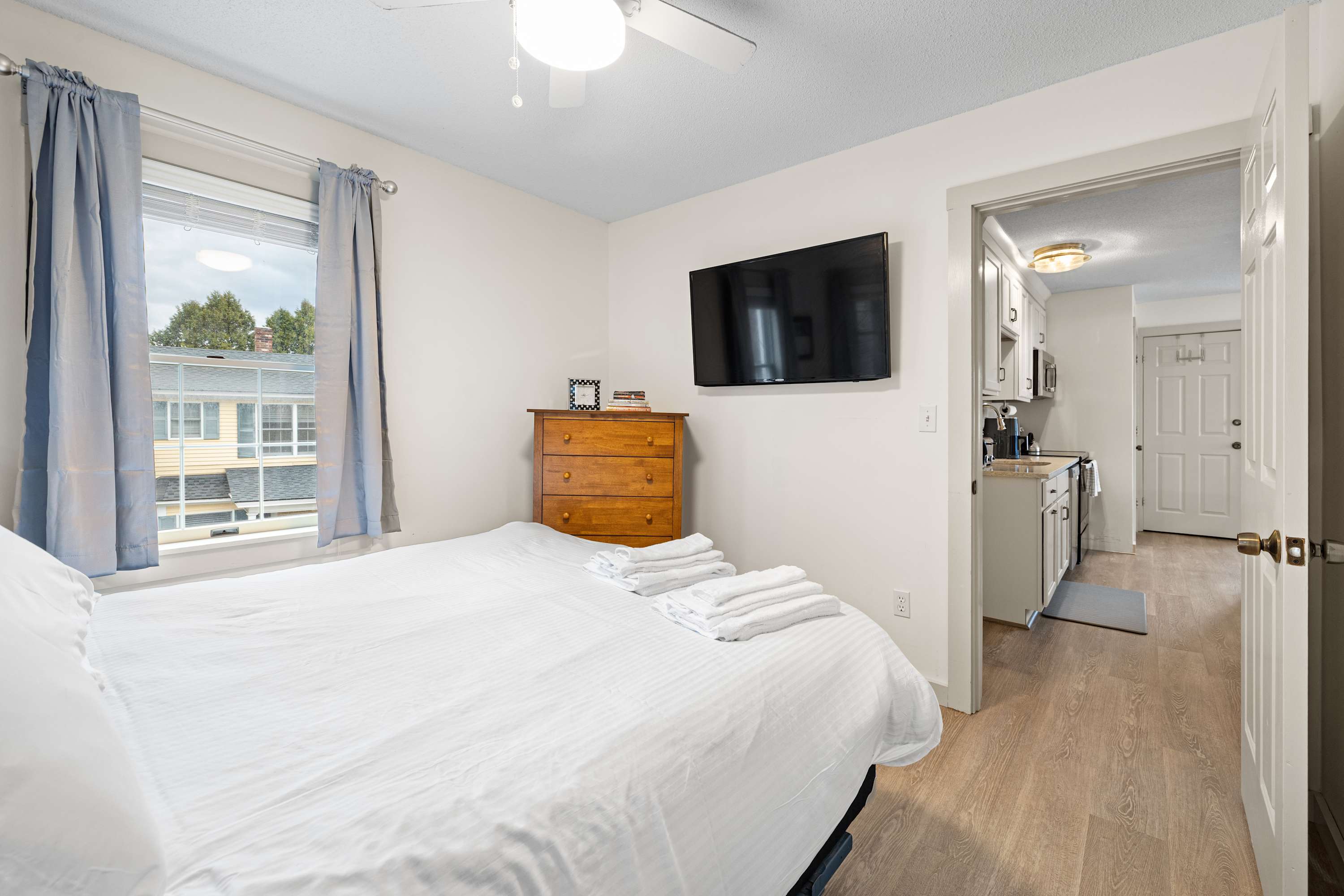 The bedroom features a queen-sized bed with fresh linens, creating a peaceful retreat during your stay.