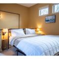 The first-level bedroom features a sprawling king-sized bed, a dresser for storage, and access to the full bath right around the corner. The second bedroom is on the upper level and features a full suite for privacy. This suite looks down over the living room with views of the mountain. The private bathroom and king-sized bed are just some of the perks of this top-level getaway.