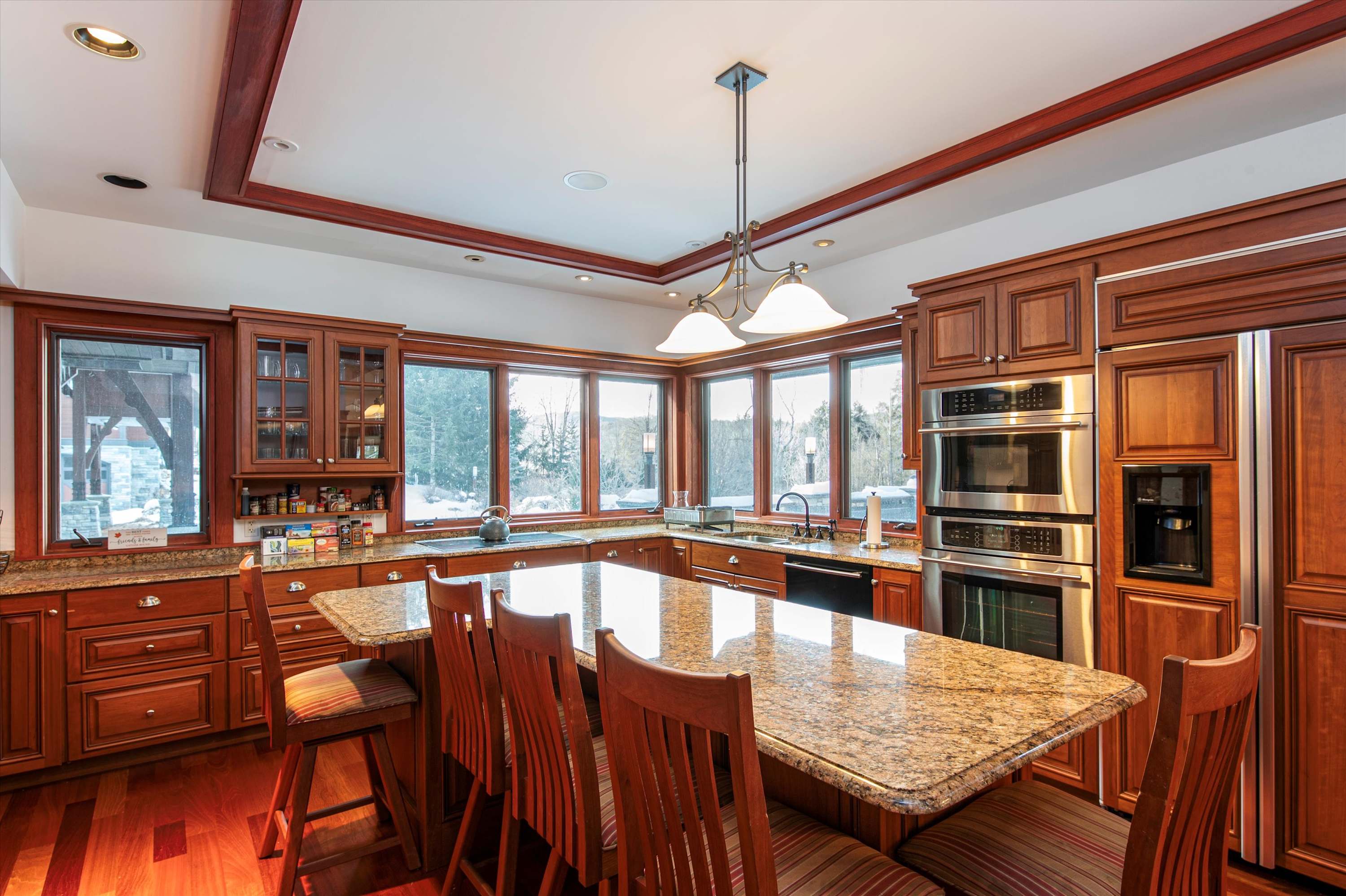 Enter through a welcoming foyer with a large mudroom for boots and winter gear. The spacious kitchen is built for groups—dual refrigerators, induction cooktop, air fryer, microwave, island seating, and plenty of prep space—flowing naturally into a dining room with seating for ten (plus extras when needed).