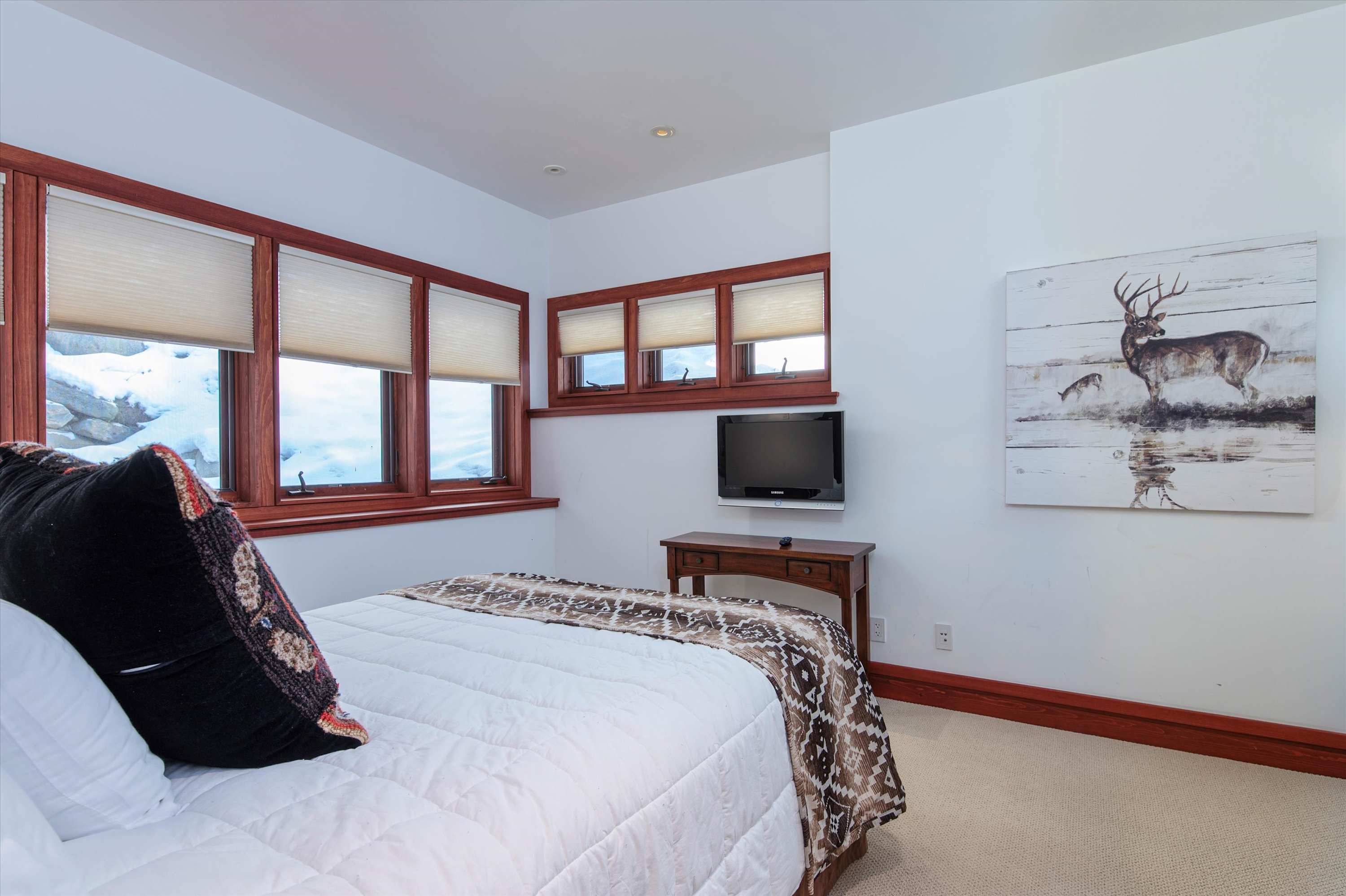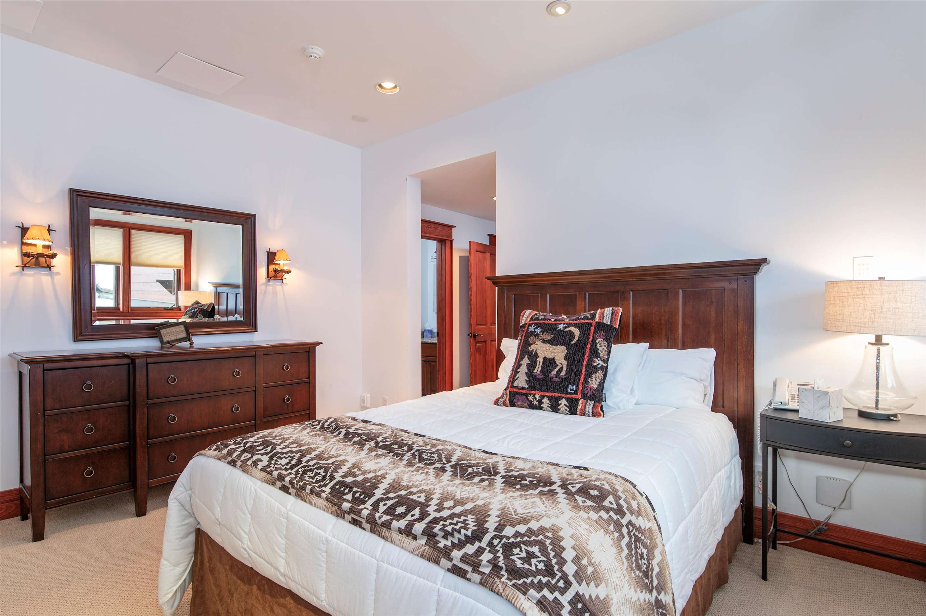 The great room anchors this level with a wood-burning fireplace, smart TV, and plentiful seating. Off the living area is a wet bar and the Catamount primary suite, featuring a king bed, gas fireplace, walk-in closet, soaking tub, and dual sinks.