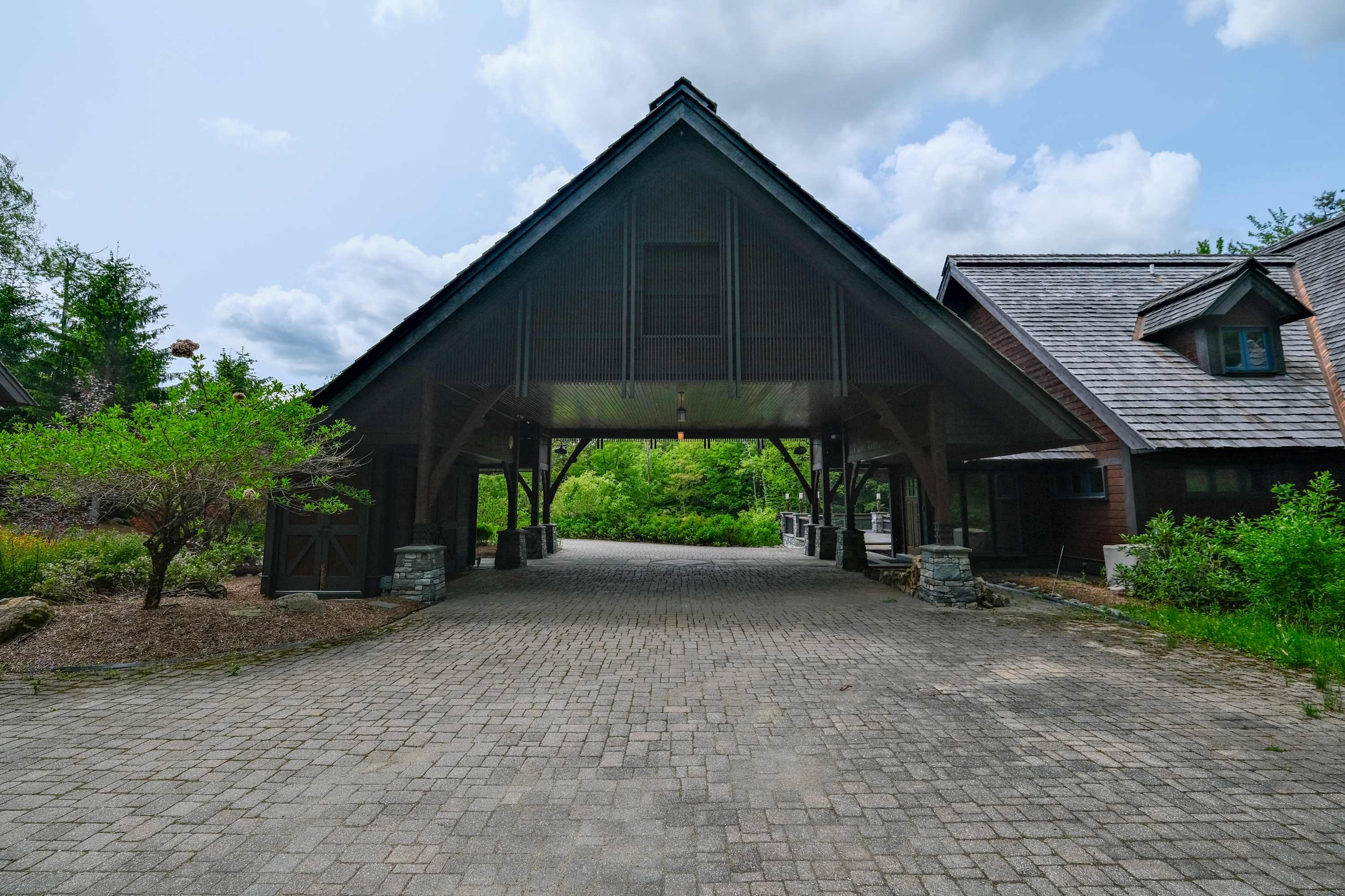 Exterior security cameras are present in the driveway