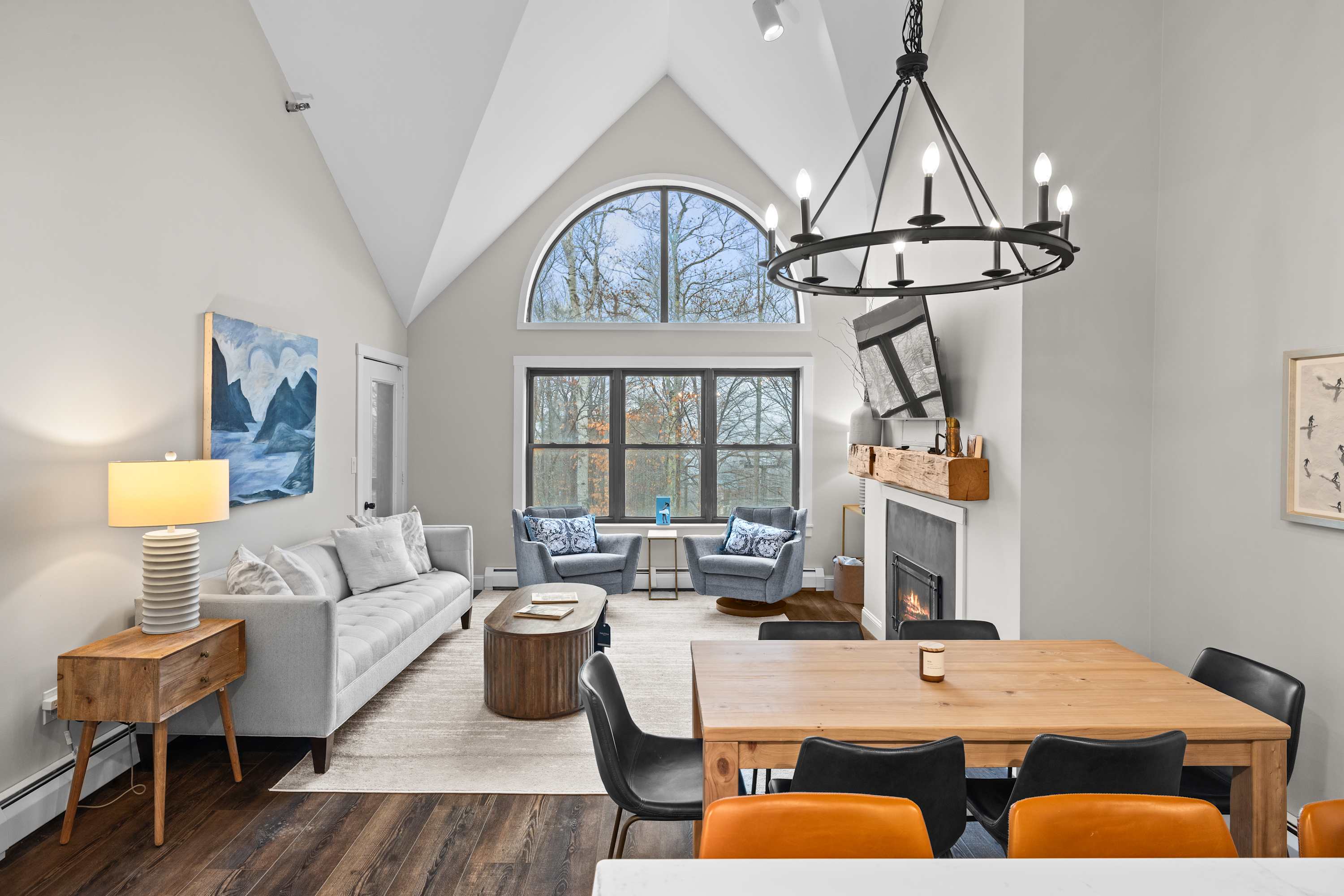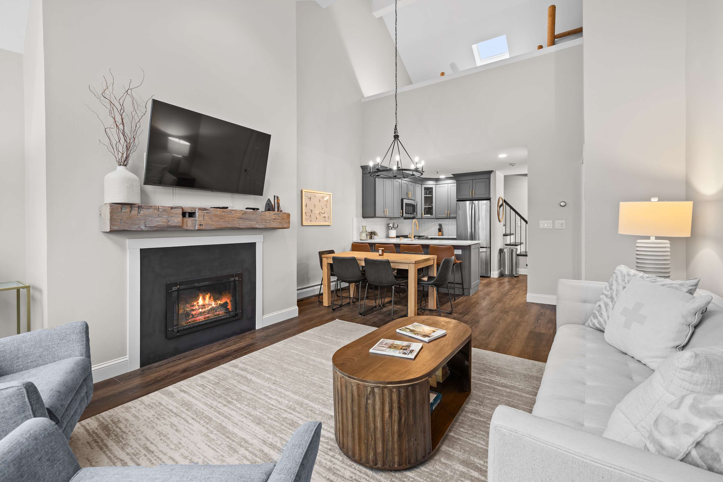This luxury Winterplace condo features two queen bedrooms plus a loft bunkroom with two twin-over-twin bunks, comfortably sleeping eight. Enjoy modern finishes, vaulted ceilings, a cozy fireplace, and big mountain-facing windows. With two full bathrooms and an unbeatable walk-to-lift location just steps from Okemo’s lifts, this is the perfect slopeside retreat for families and groups.