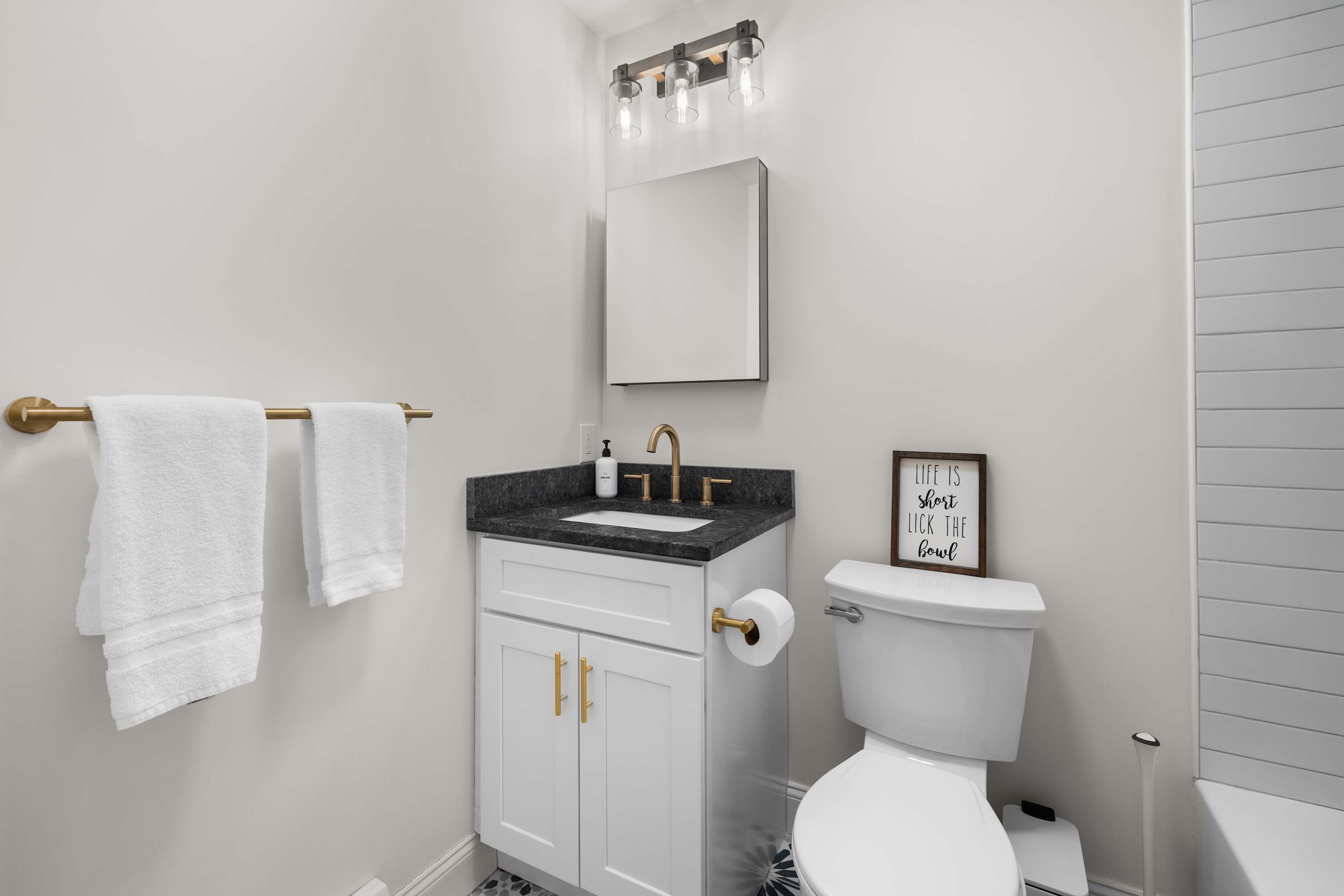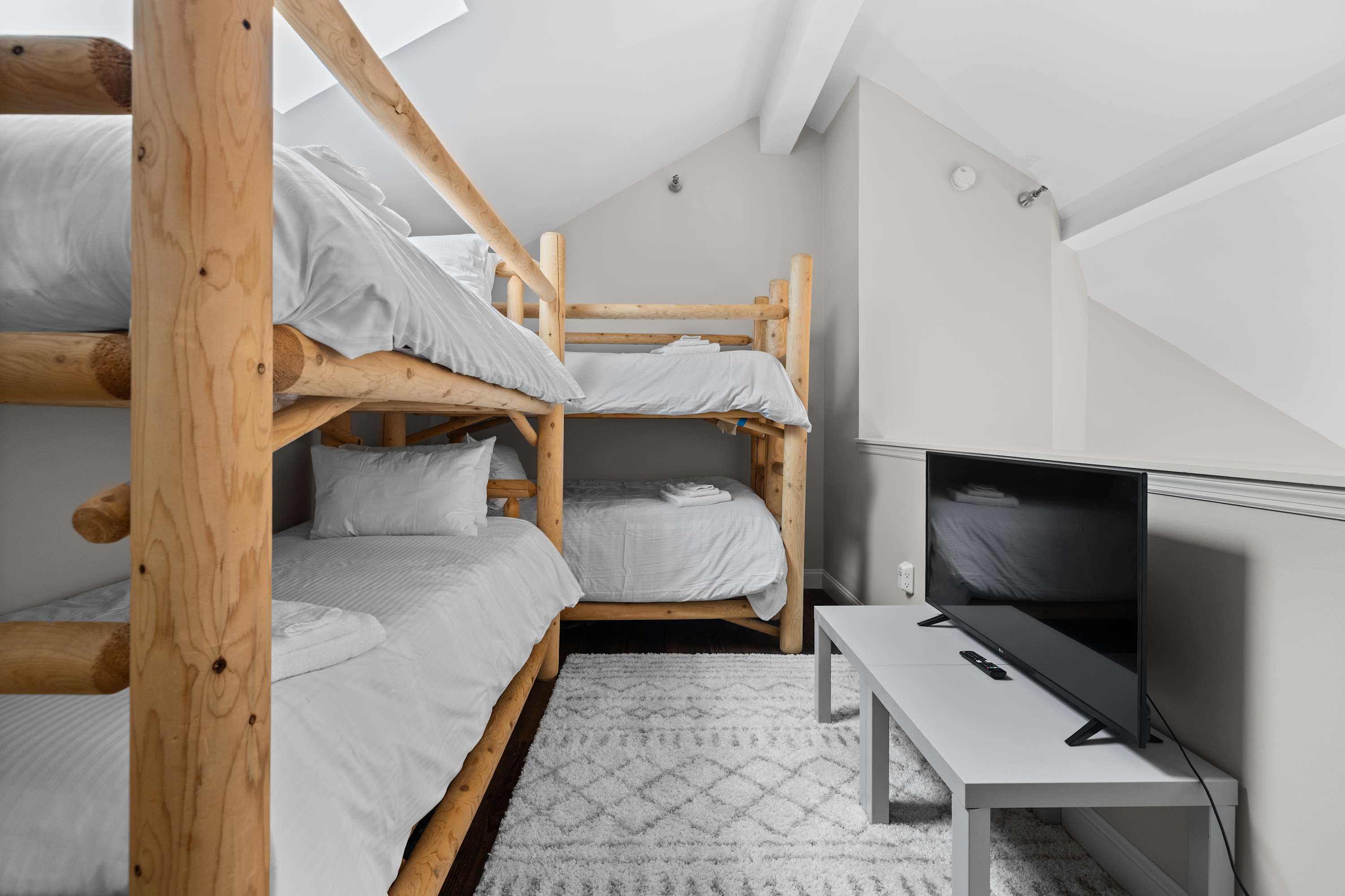 Two queen bedrooms on the main level provide calm, comfortable places to unwind, each situated close to a full bathroom. One bathroom features a walk-in shower while the other includes a tub/shower combo, offering flexibility for families and groups. Upstairs, the loft bunkroom becomes its own retreat with two twin-over-twin bunks and a dedicated TV area, giving kids or additional guests a space to call their own.