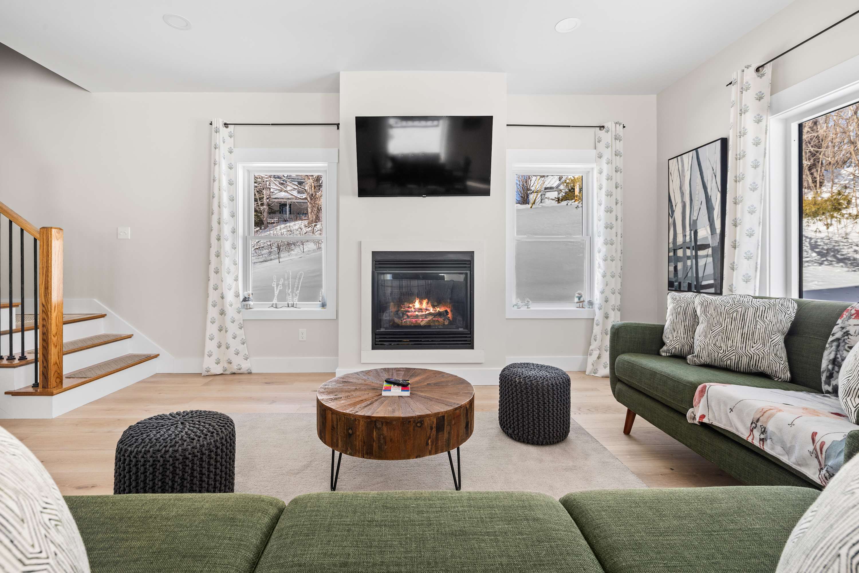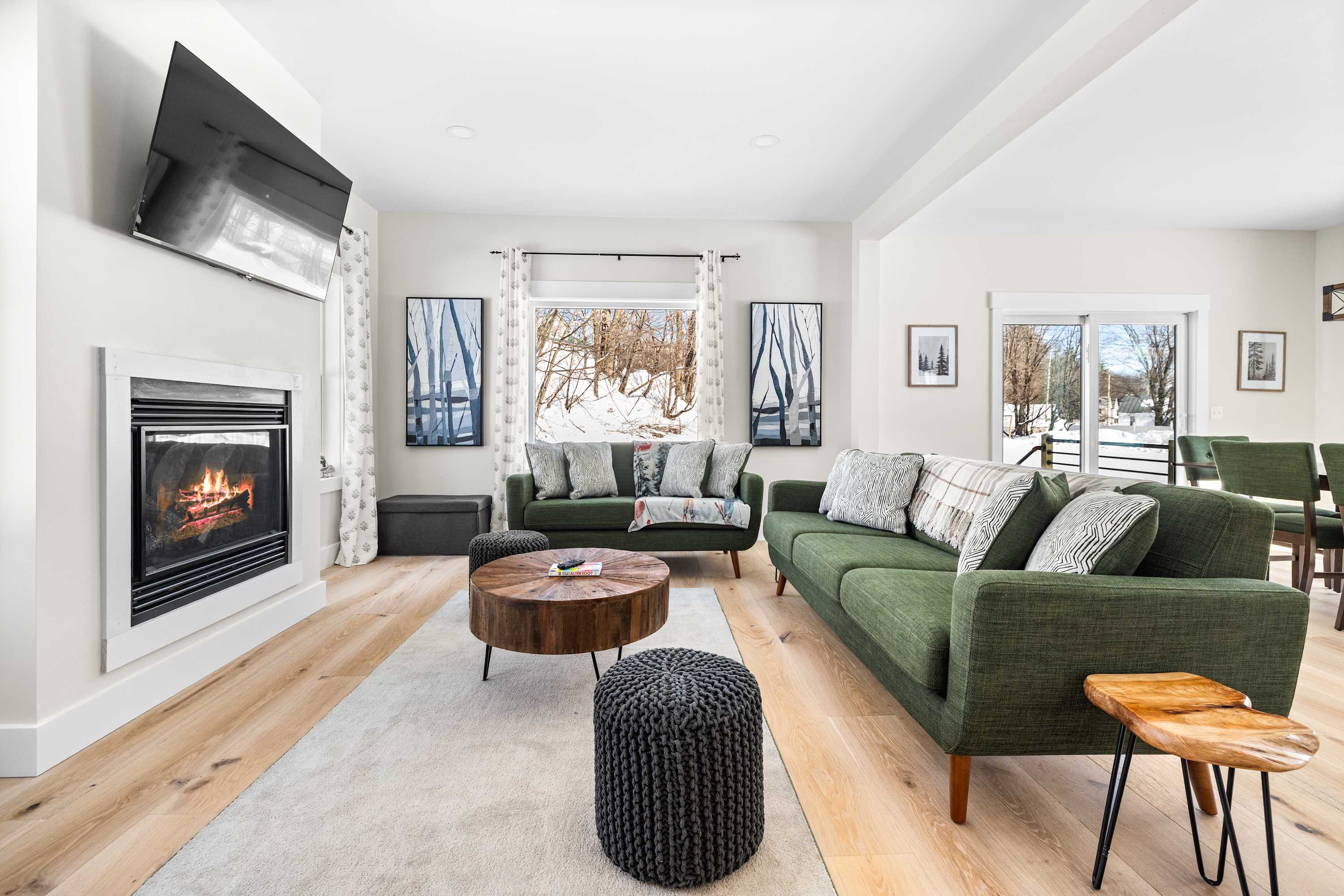 Inside, the home features a bright open-concept living area designed for gathering. Large windows bring in natural light while the cozy gas fireplace creates the perfect place to relax after a day outdoors. Whether you’re returning from a ski day at Okemo or exploring the surrounding mountains, this comfortable space makes it easy to unwind.