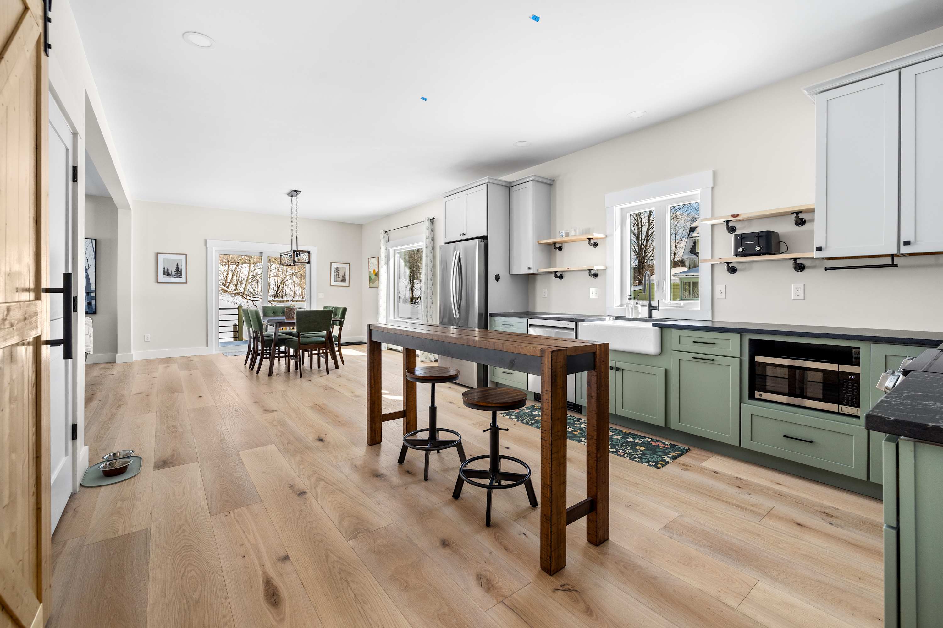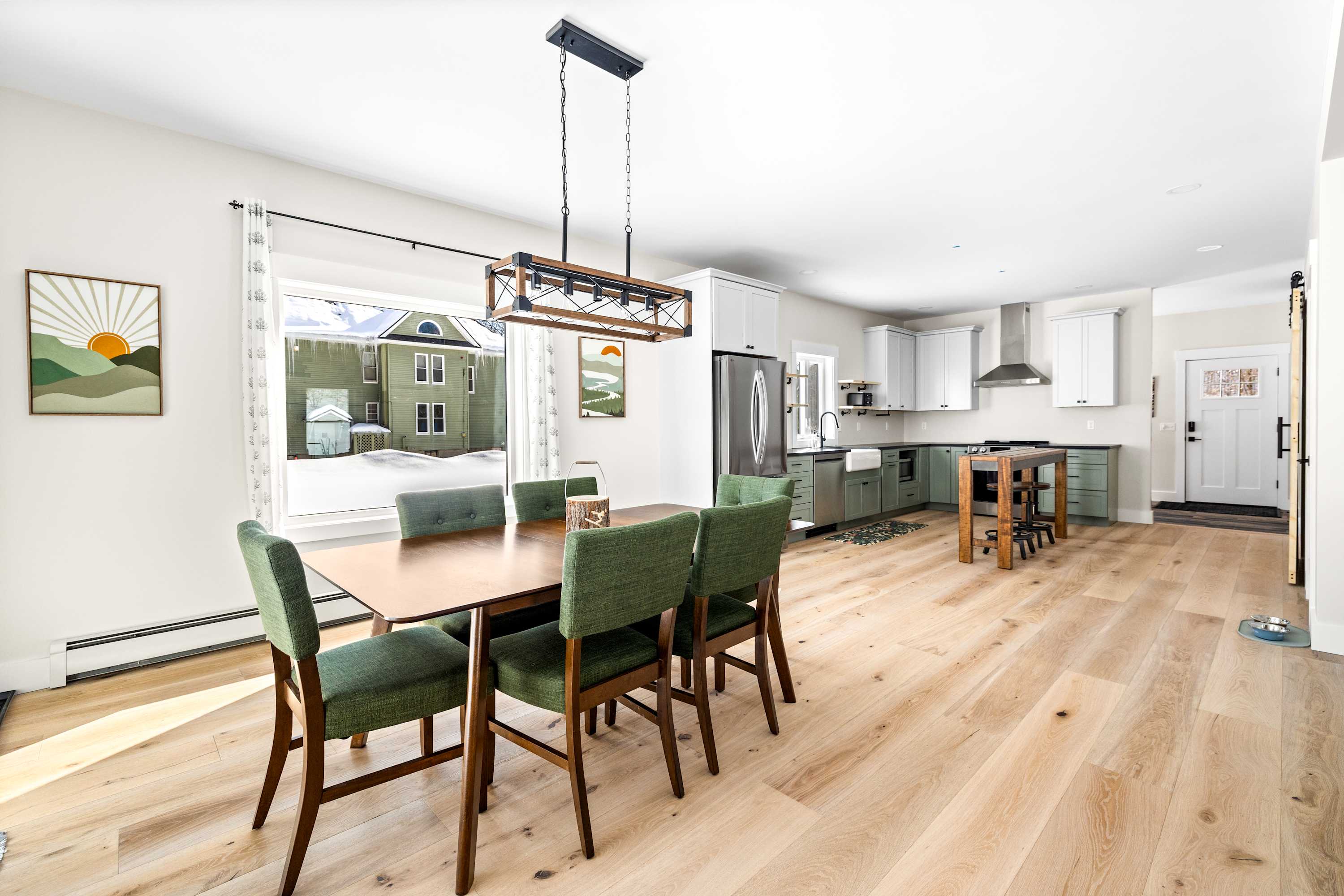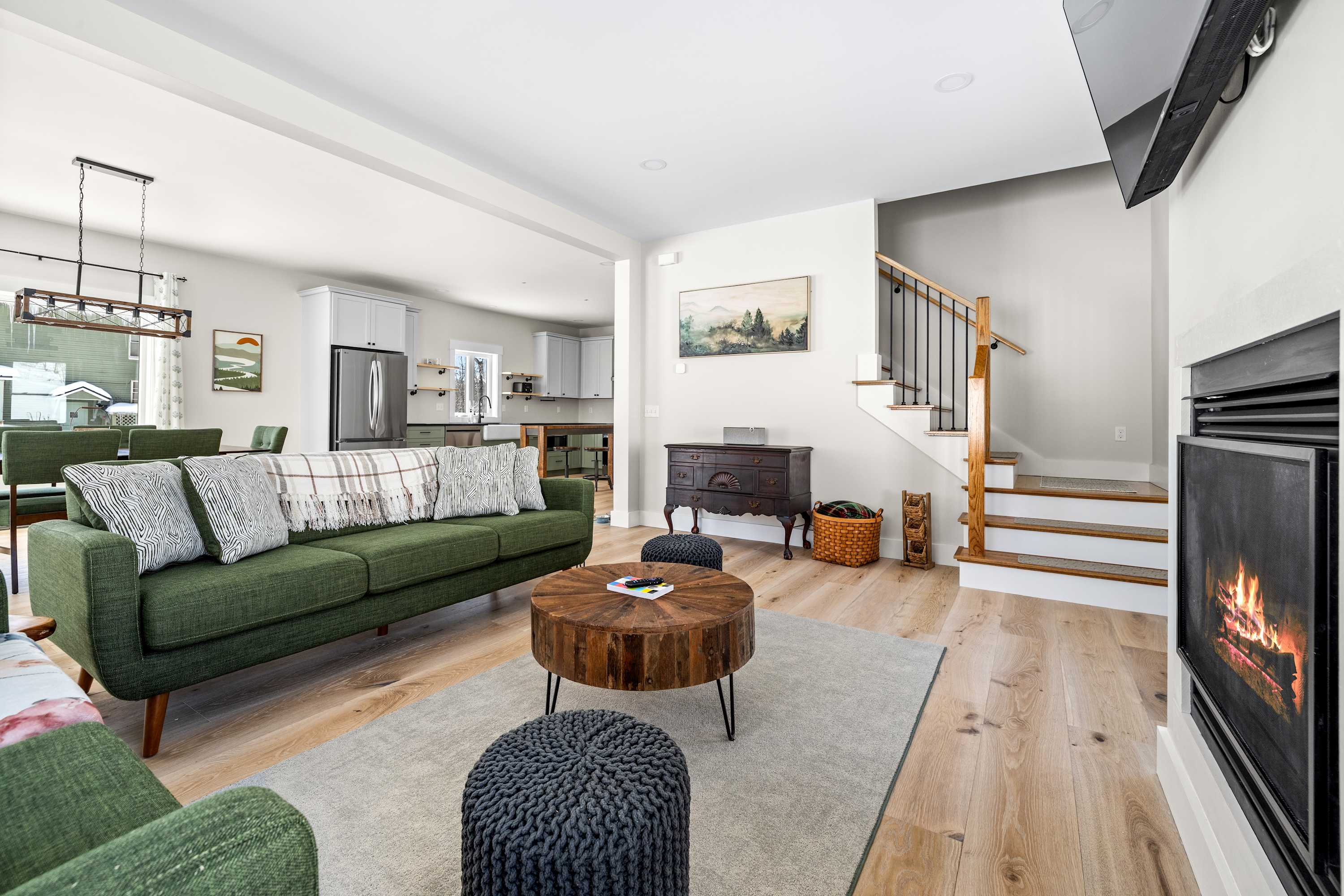 The living room flows seamlessly into the dining area and fully equipped kitchen, making it easy for everyone to spend time together whether you’re preparing meals, sharing stories from the slopes, or settling in for a movie night. The kitchen includes modern appliances, generous counter space, and a large island that makes cooking for a group simple and enjoyable.