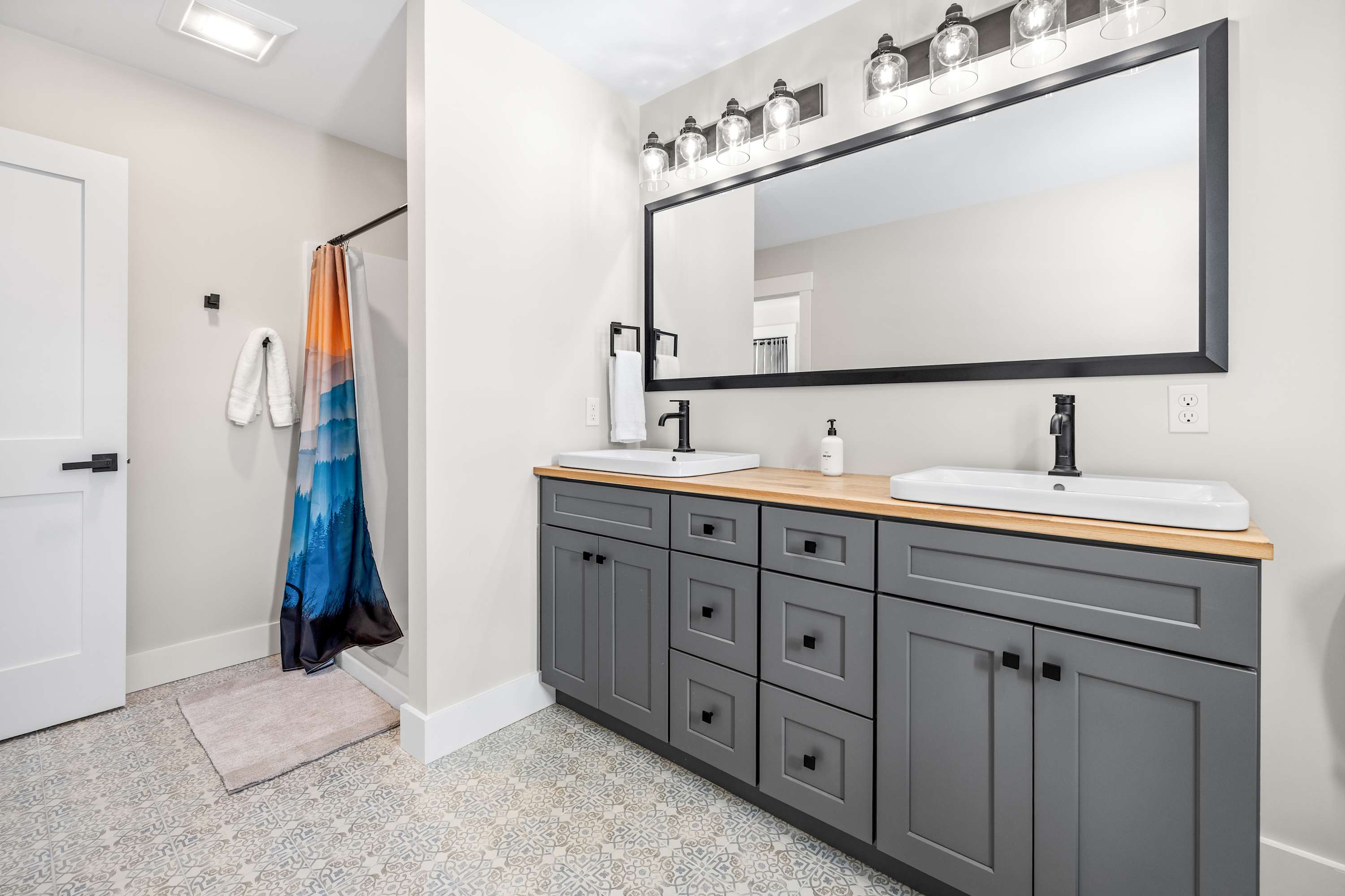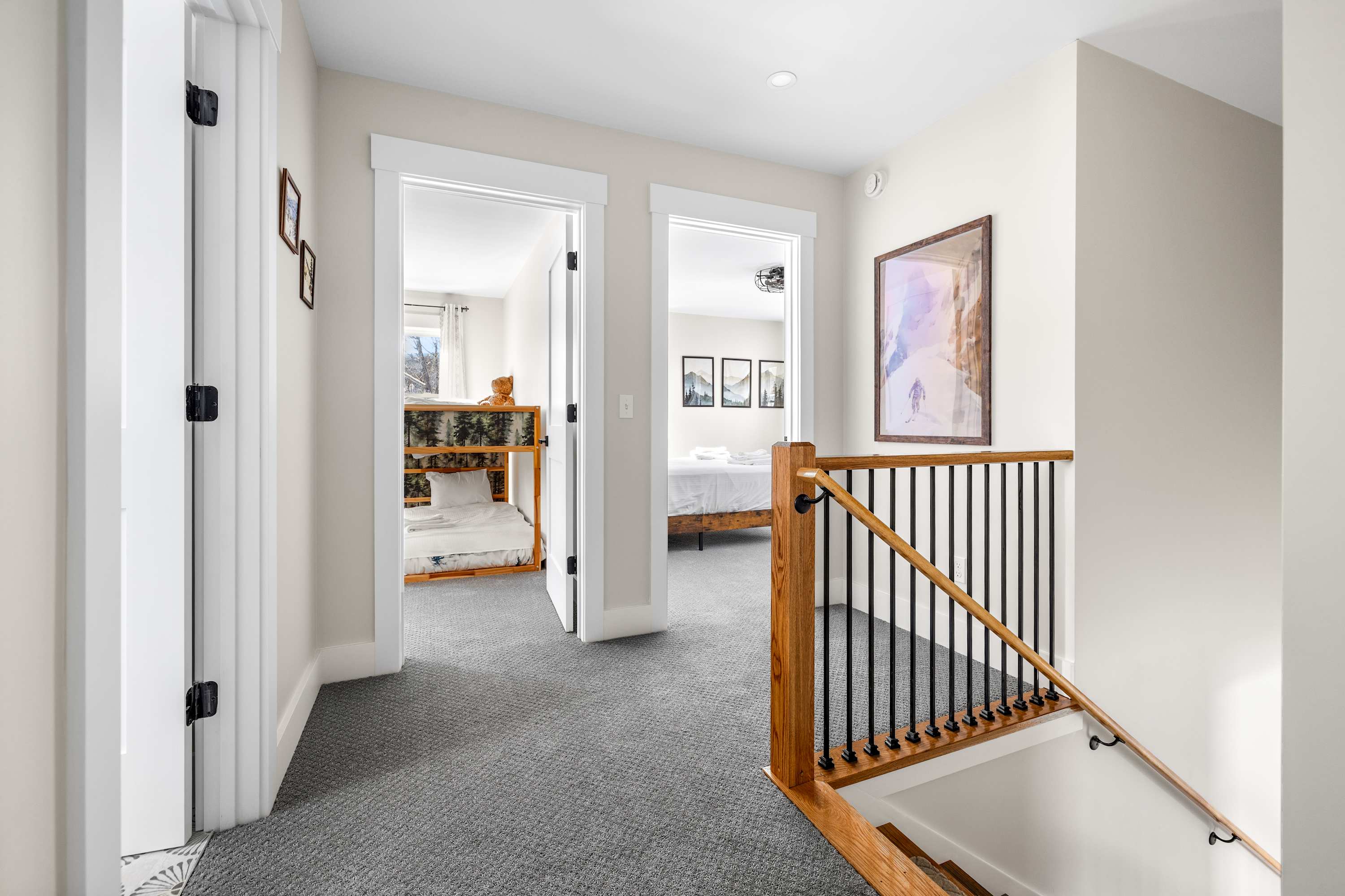 Upstairs you’ll find three comfortable bedrooms designed for both relaxation and flexibility. The primary bedroom features a king bed and a large ensuite bathroom with a double vanity and walk-in shower. A second bedroom includes a queen bed, while the third bedroom offers two twin-over-twin bunk beds, making the home ideal for families or groups traveling together.