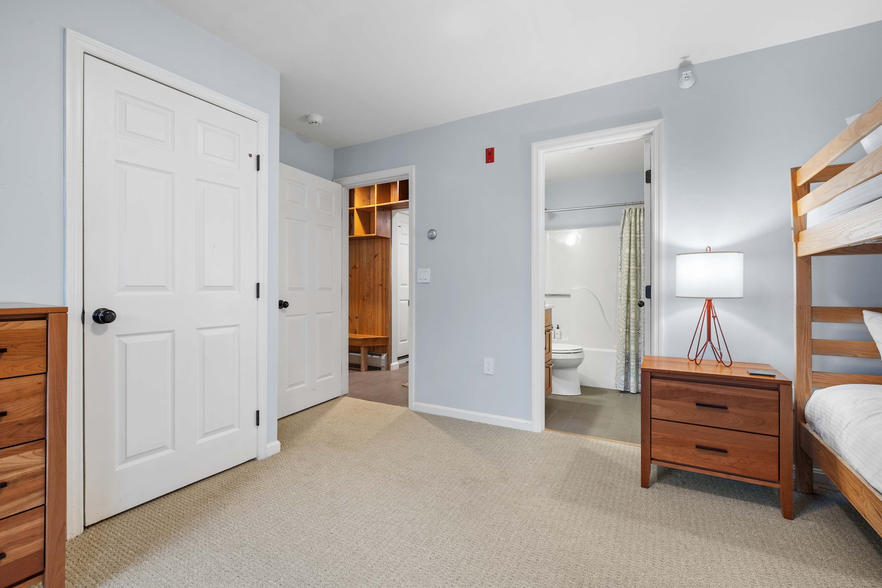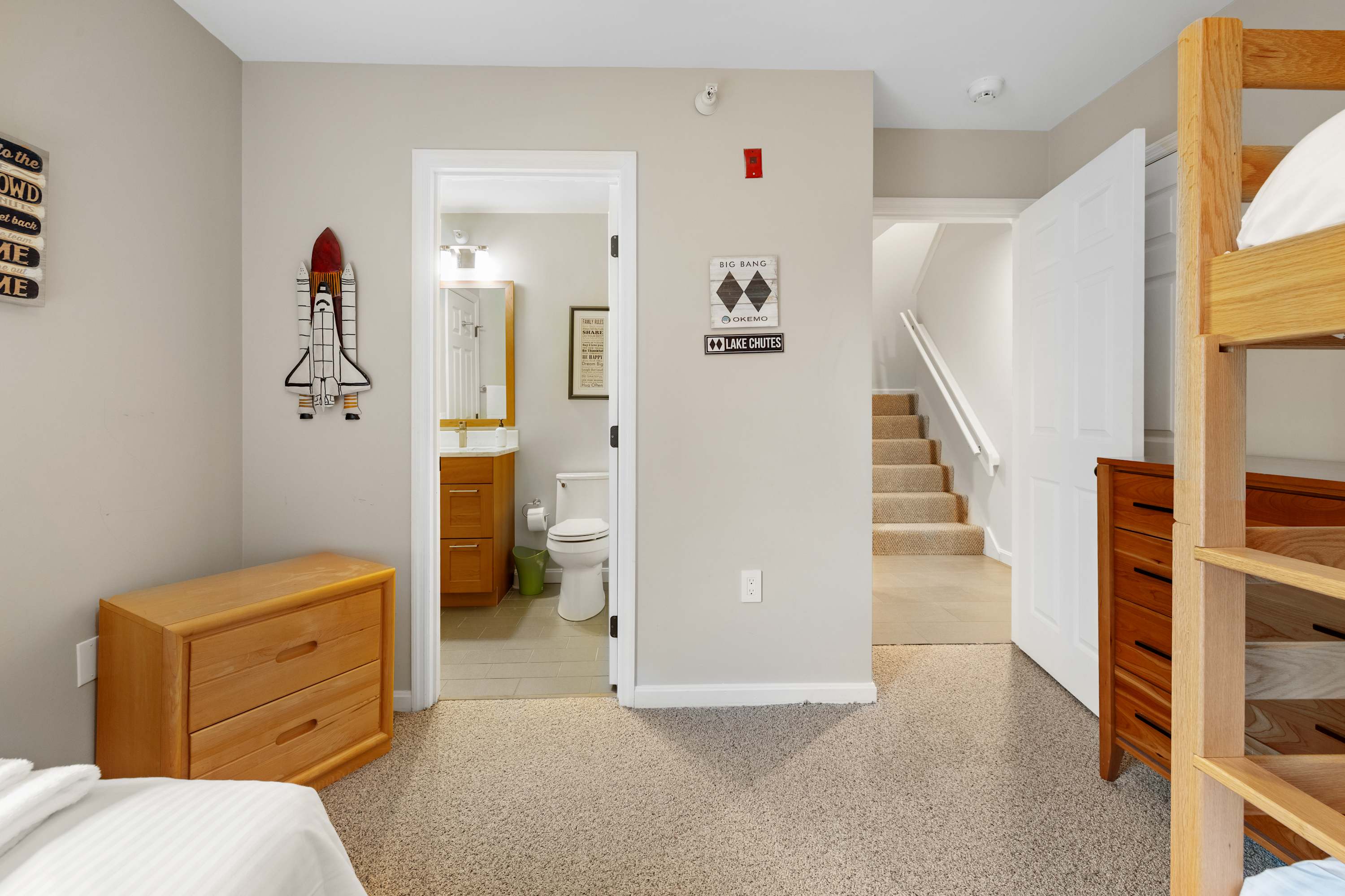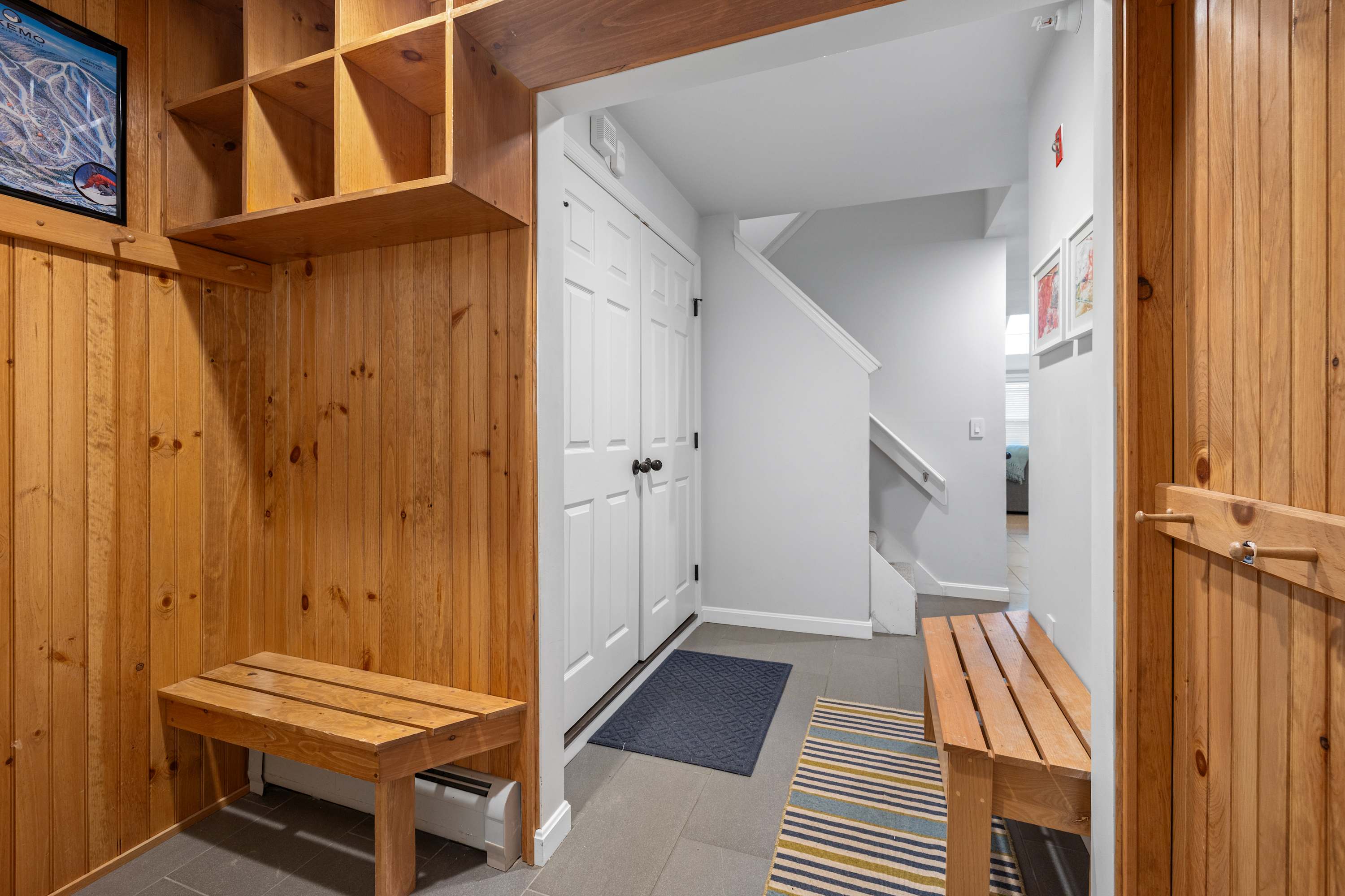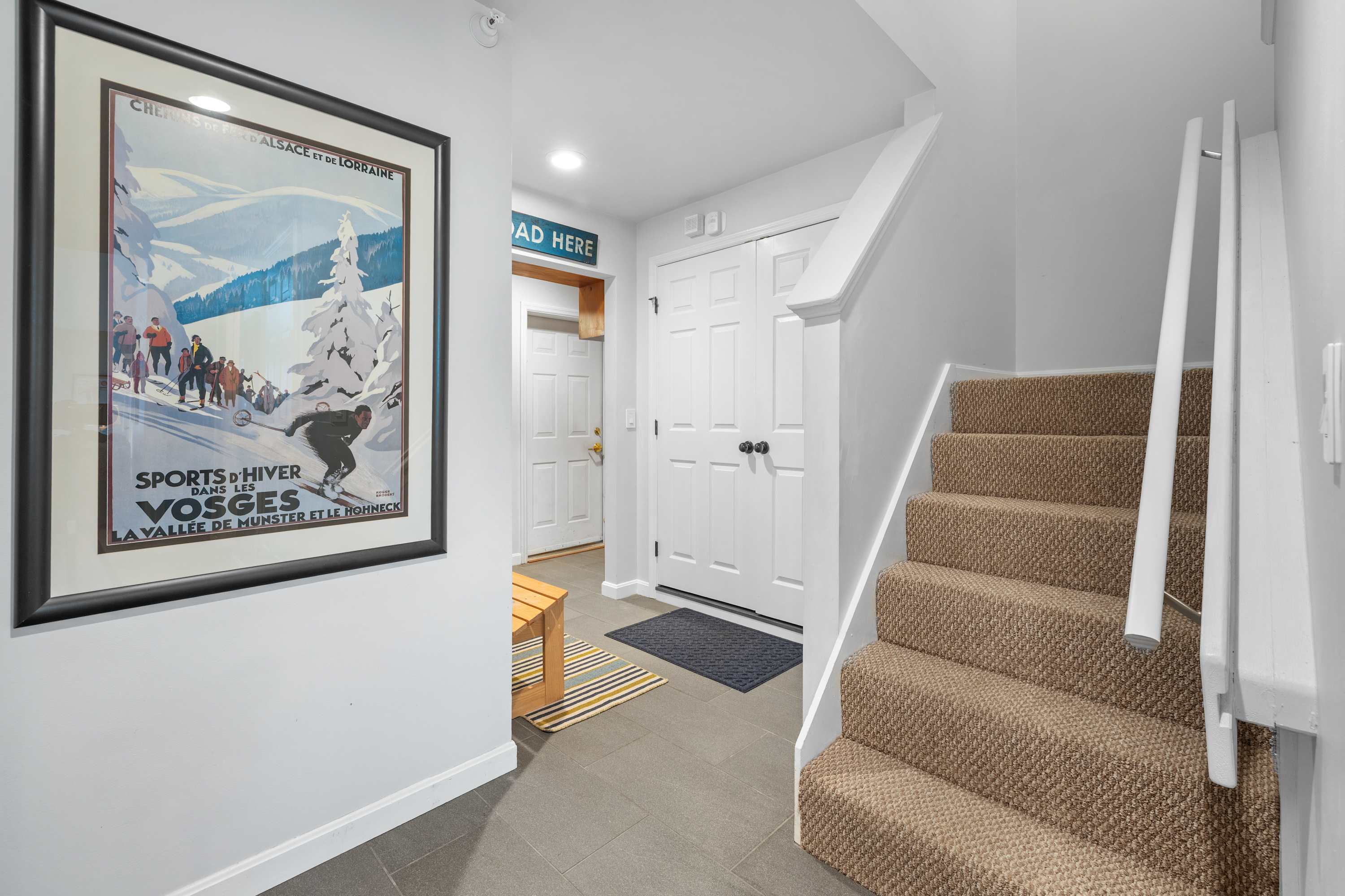 The entry area offers thoughtful storage for boots and gear, and the in-unit laundry keeps the day-to-day practicalities easy. A dedicated ski locker and two parking passes add to the convenience. For slope access, a brief 300-foot walk across the parking area leads directly to the trail, giving families the freedom to come and go without relying on shuttles or long treks.