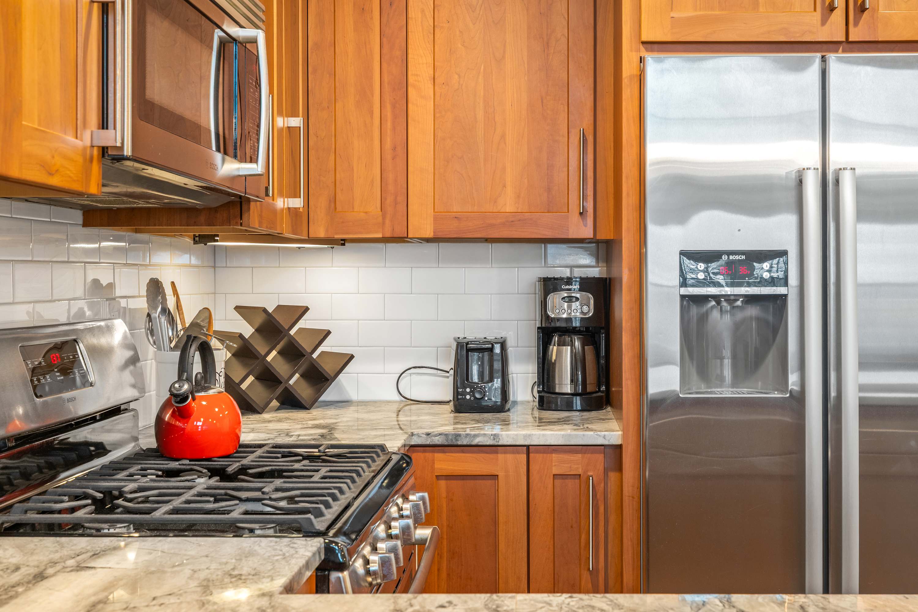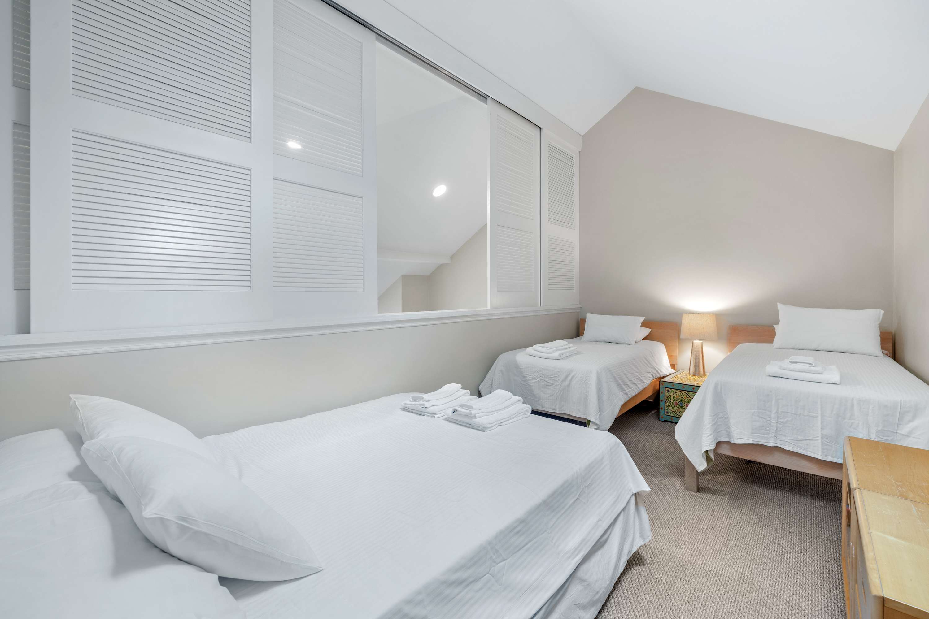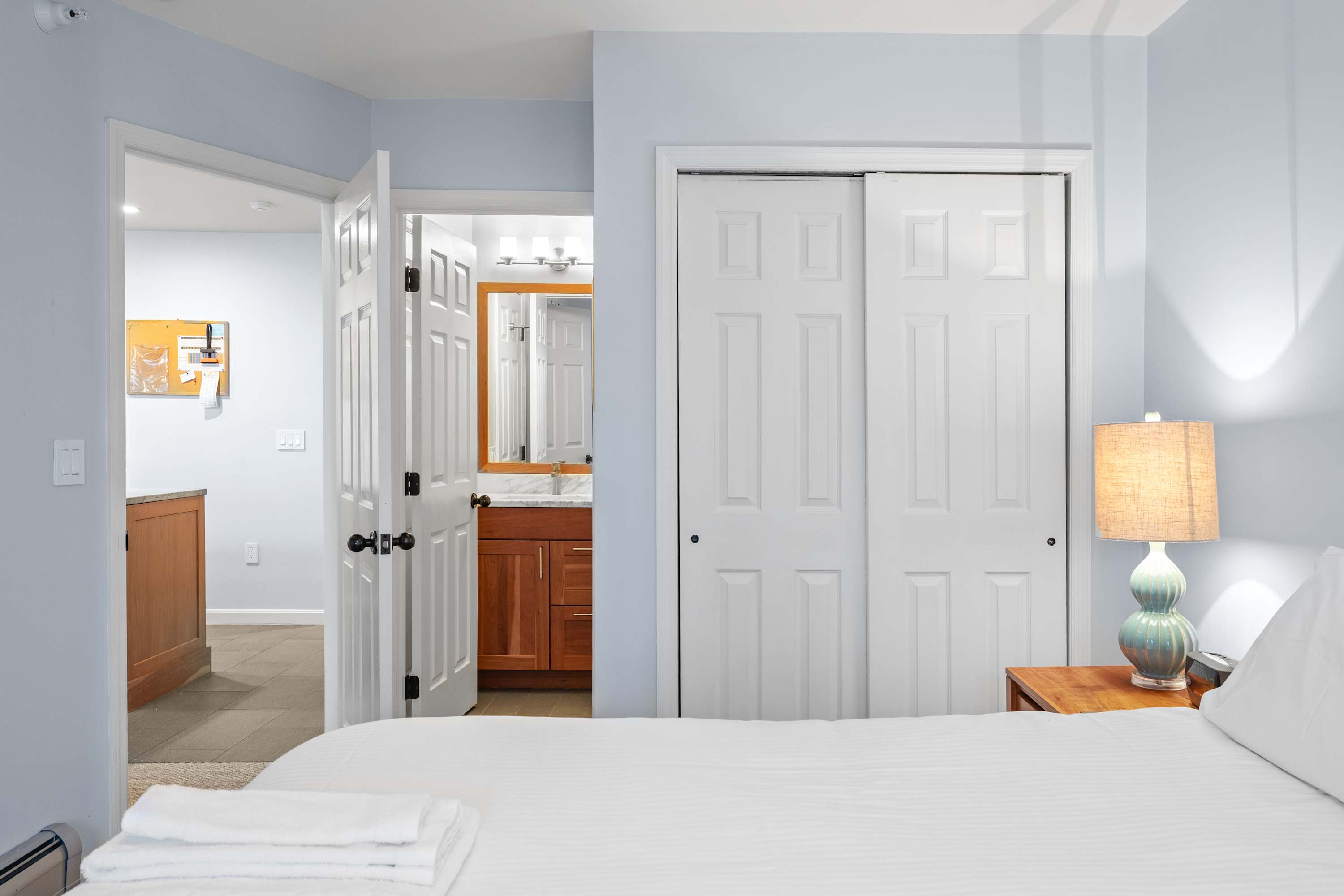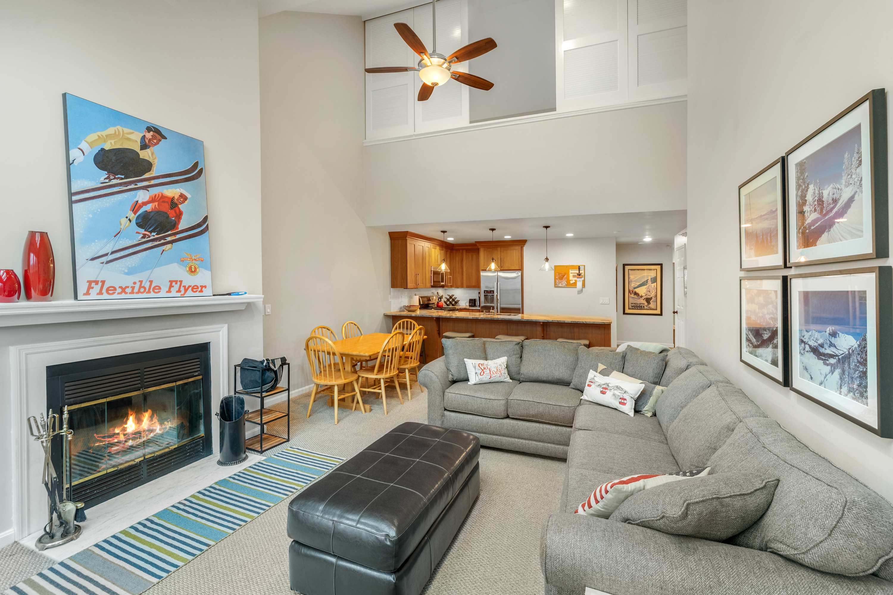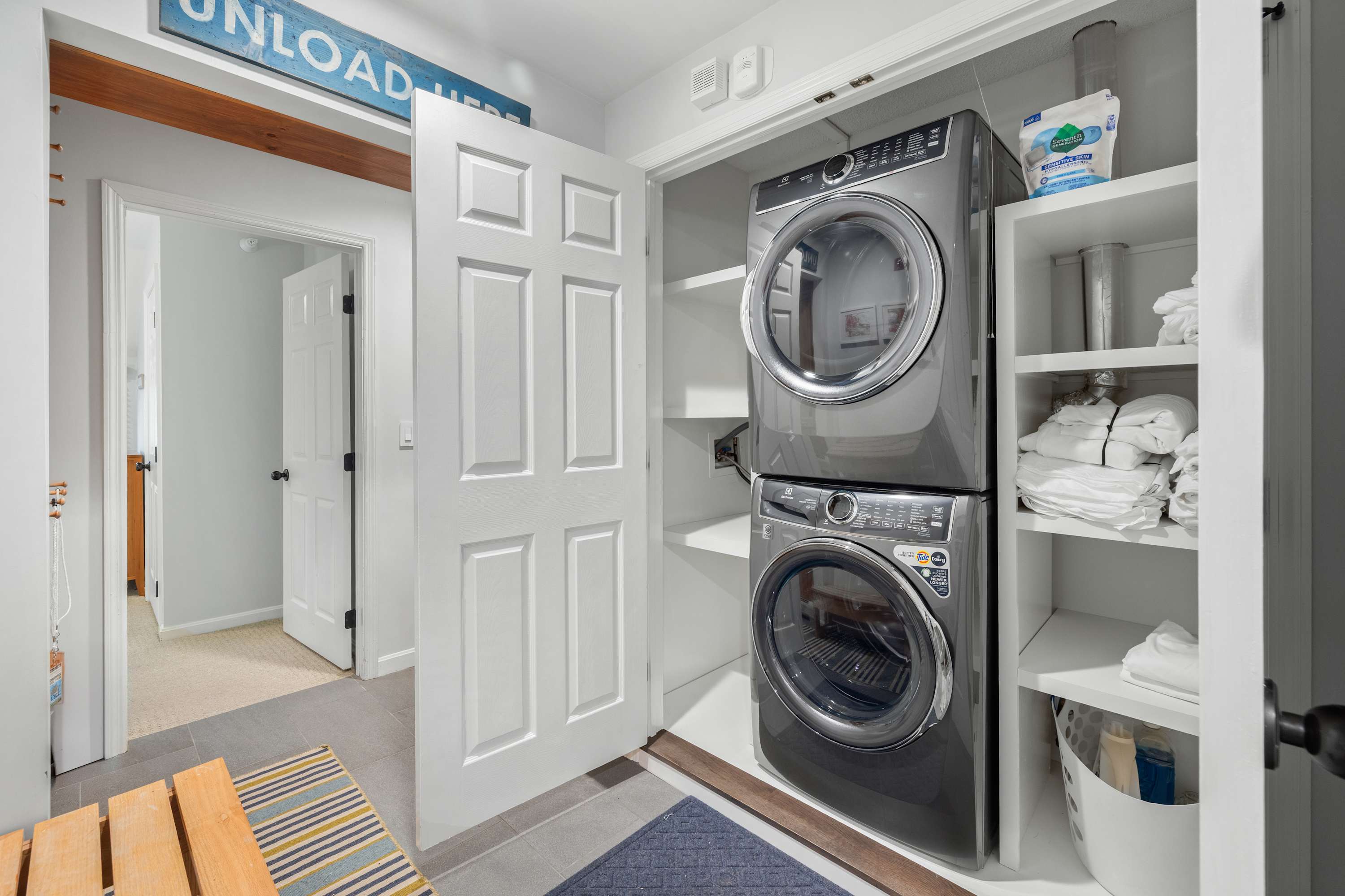 The entry area offers thoughtful storage for boots and gear, and the in-unit laundry keeps the day-to-day practicalities easy. A dedicated ski locker and two parking passes add to the convenience. For slope access, a brief 300-foot walk across the parking area leads directly to the trail, giving families the freedom to come and go without relying on shuttles or long treks.