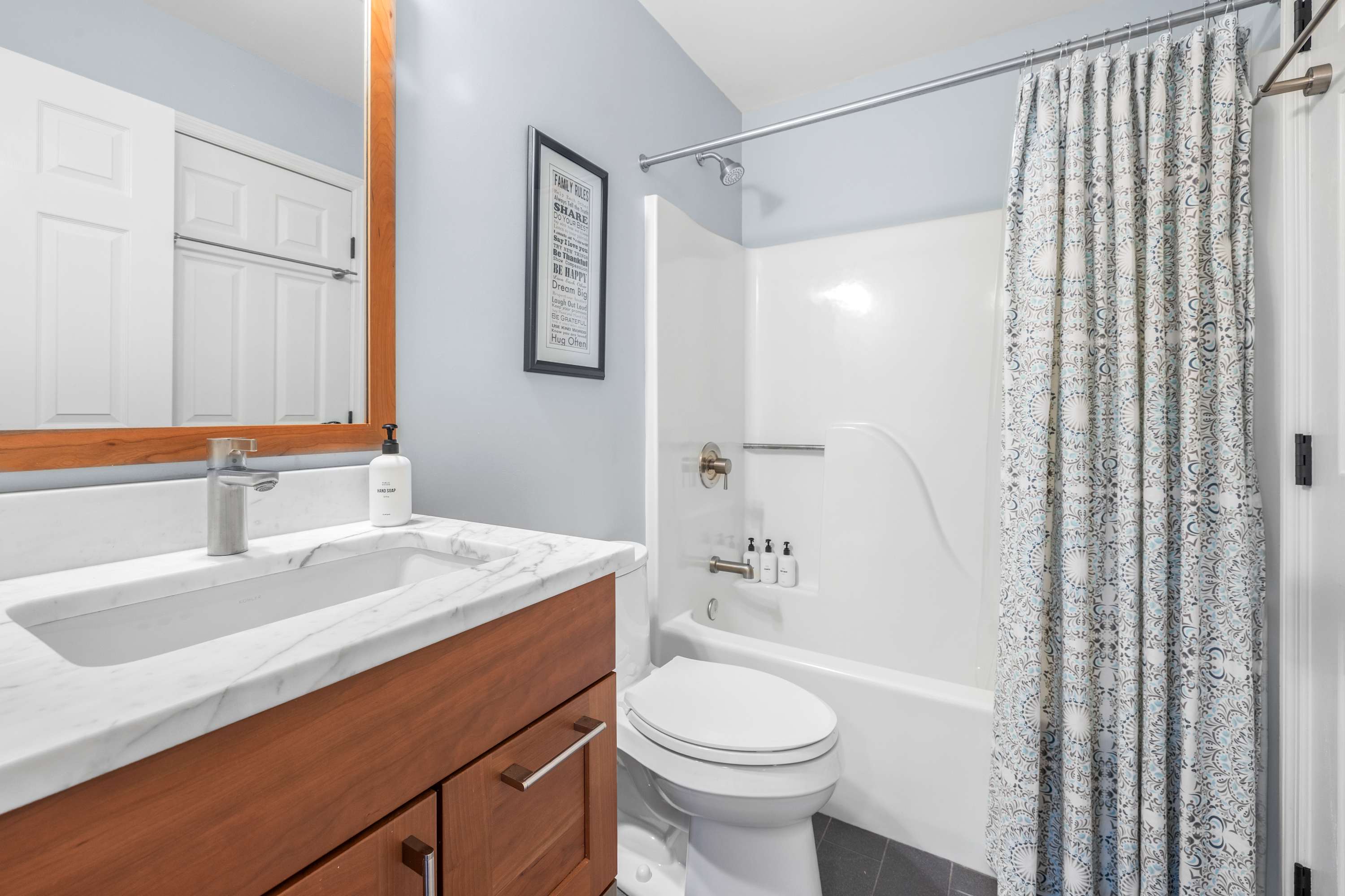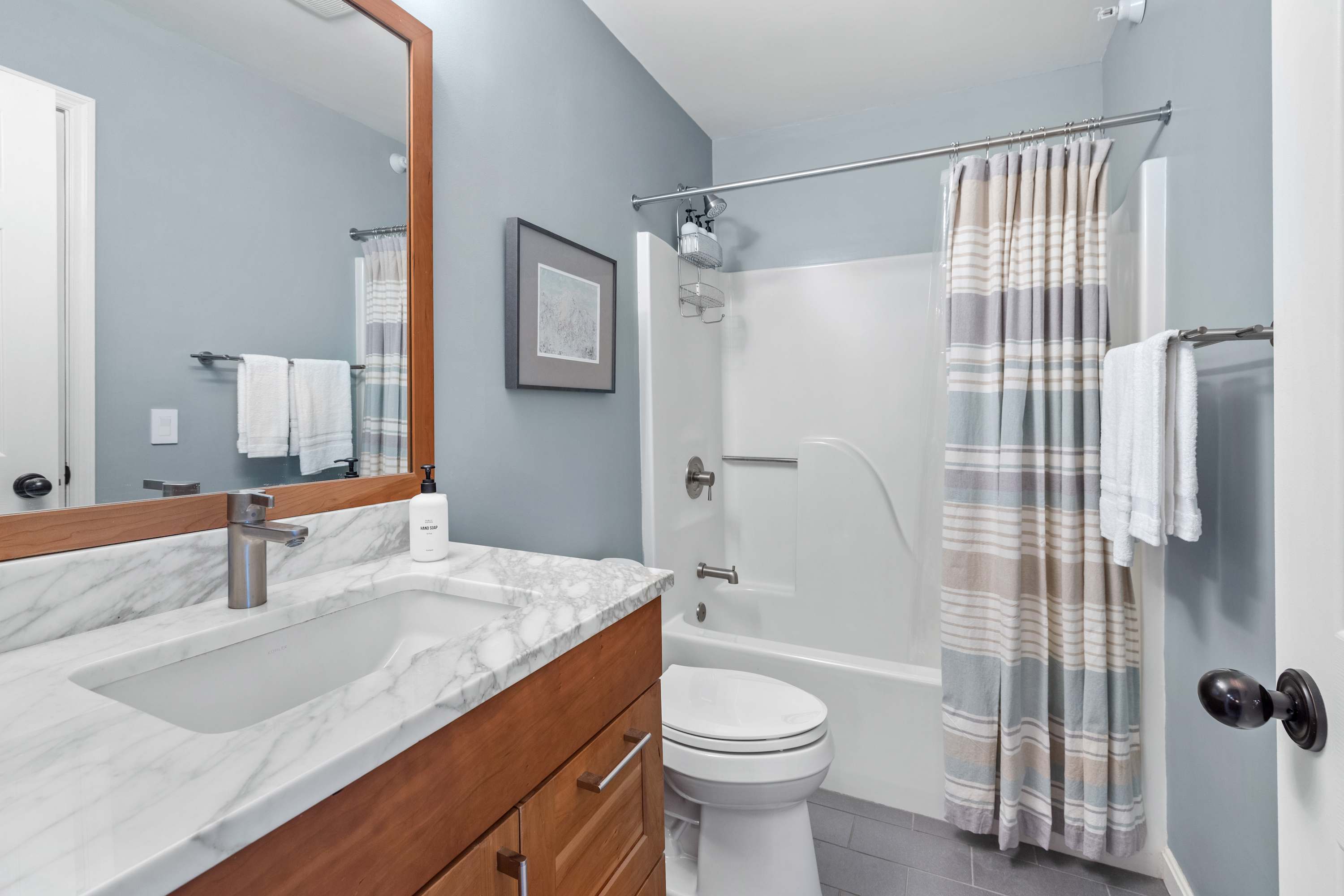 The king primary bedroom sits just off the main living space, giving parents or grandparents a quiet place to unwind. Its attached bathroom connects both to the bedroom and the common area, offering flexibility during busy mornings. Nearby, a second bedroom with a bunk and a single bed creates a cozy spot for kids or siblings to share, and it connects through a Jack-and-Jill bathroom to a third bunkroom. The connected spaces make bedtime routines simple while still giving everyone a sense of their own corner of the home.