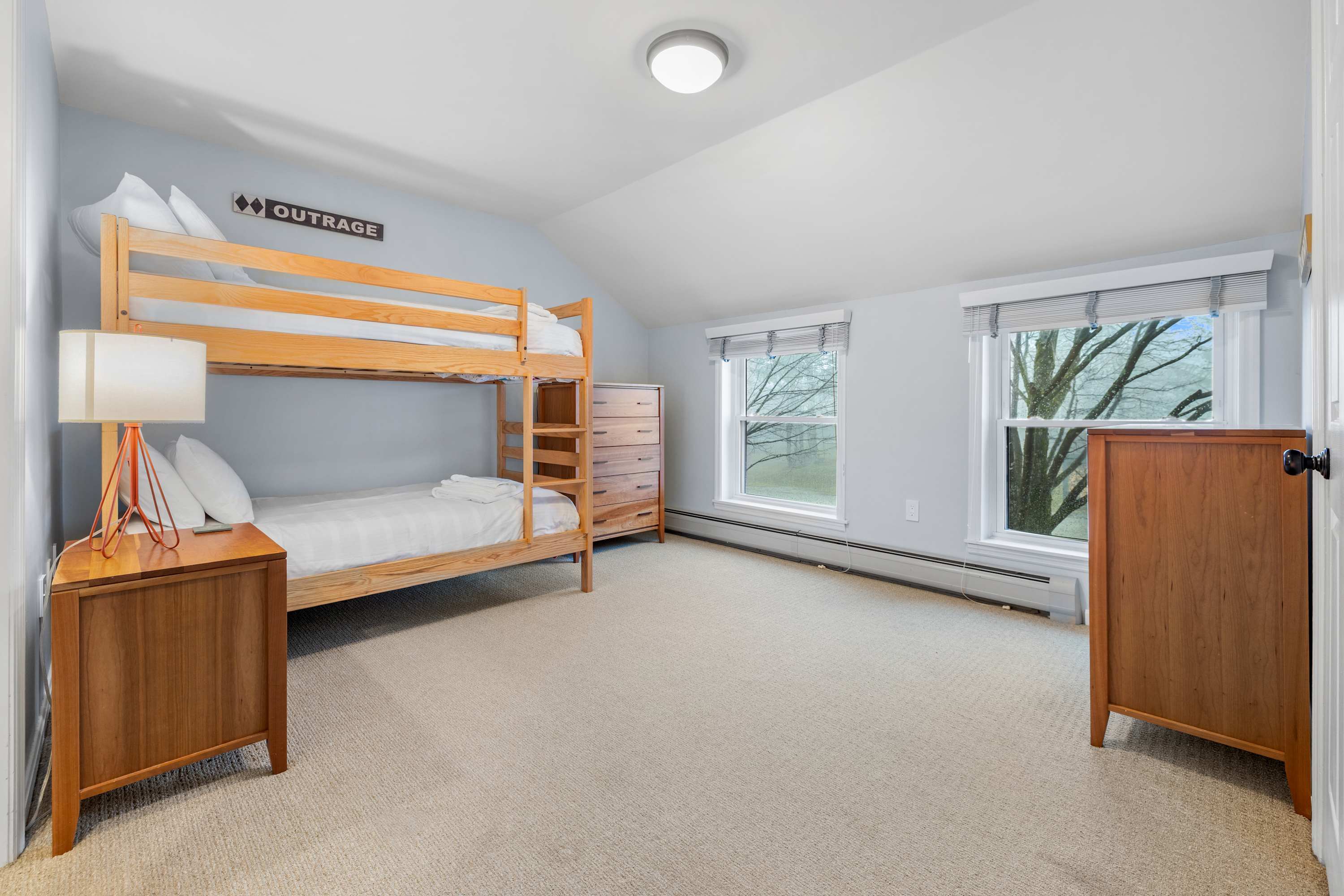 This spacious ski-in/ski-out Okemo retreat offers room for up to ten guests with a king primary suite, two bunk rooms, and a loft with additional beds. Vaulted ceilings, a wood-burning fireplace, and a well-equipped kitchen create a welcoming place to relax after a day on the mountain. With easy trail access, two bathrooms, laundry, a ski locker, and Winterplace amenities, it’s ideal for families and groups.