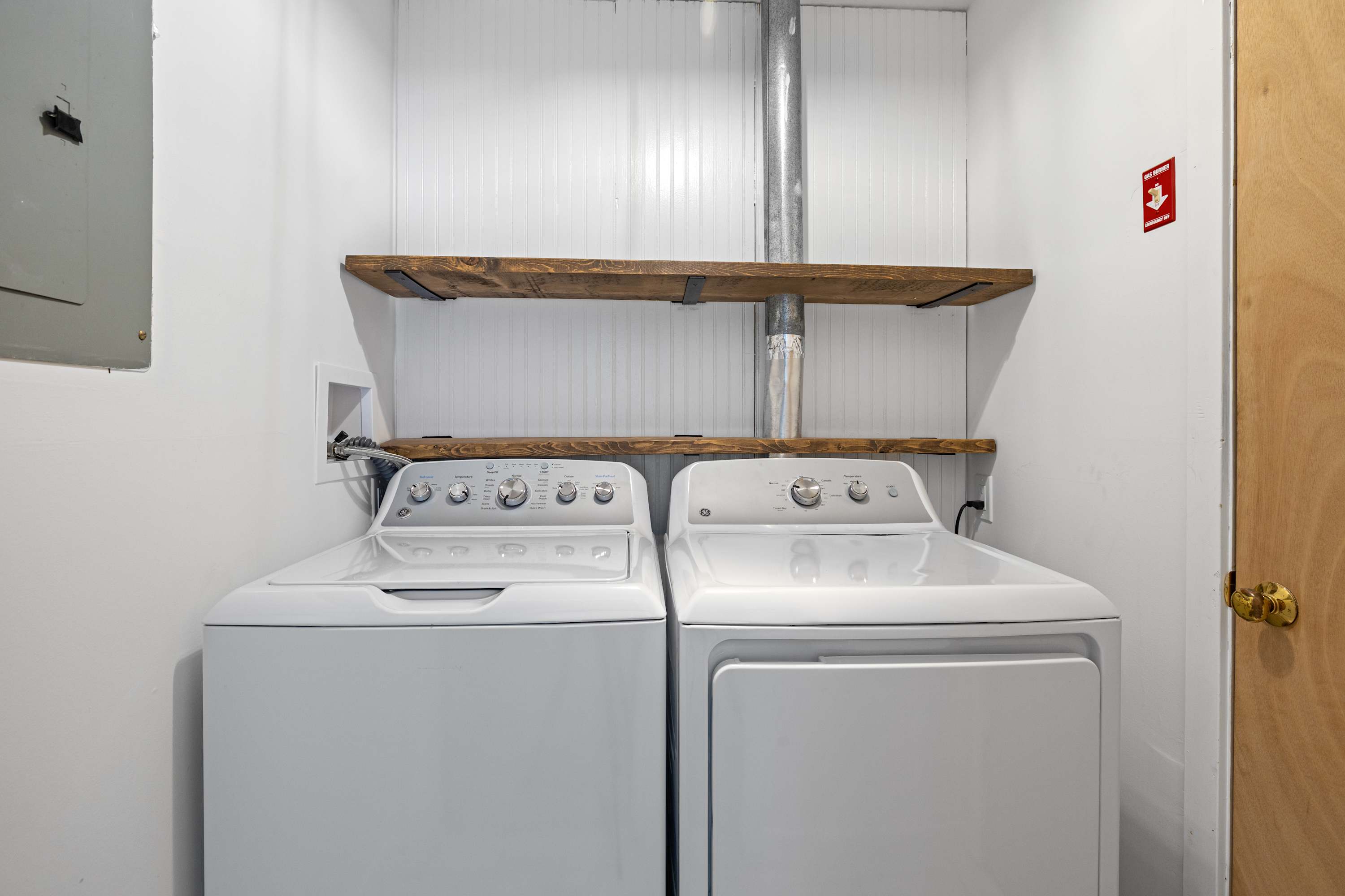 The lower level includes three additional bedrooms, all with queen beds, a full bathroom with tub and shower, and an enclosed laundry area with washer and dryer. This setup works especially well for families and mixed groups, offering privacy without separation.