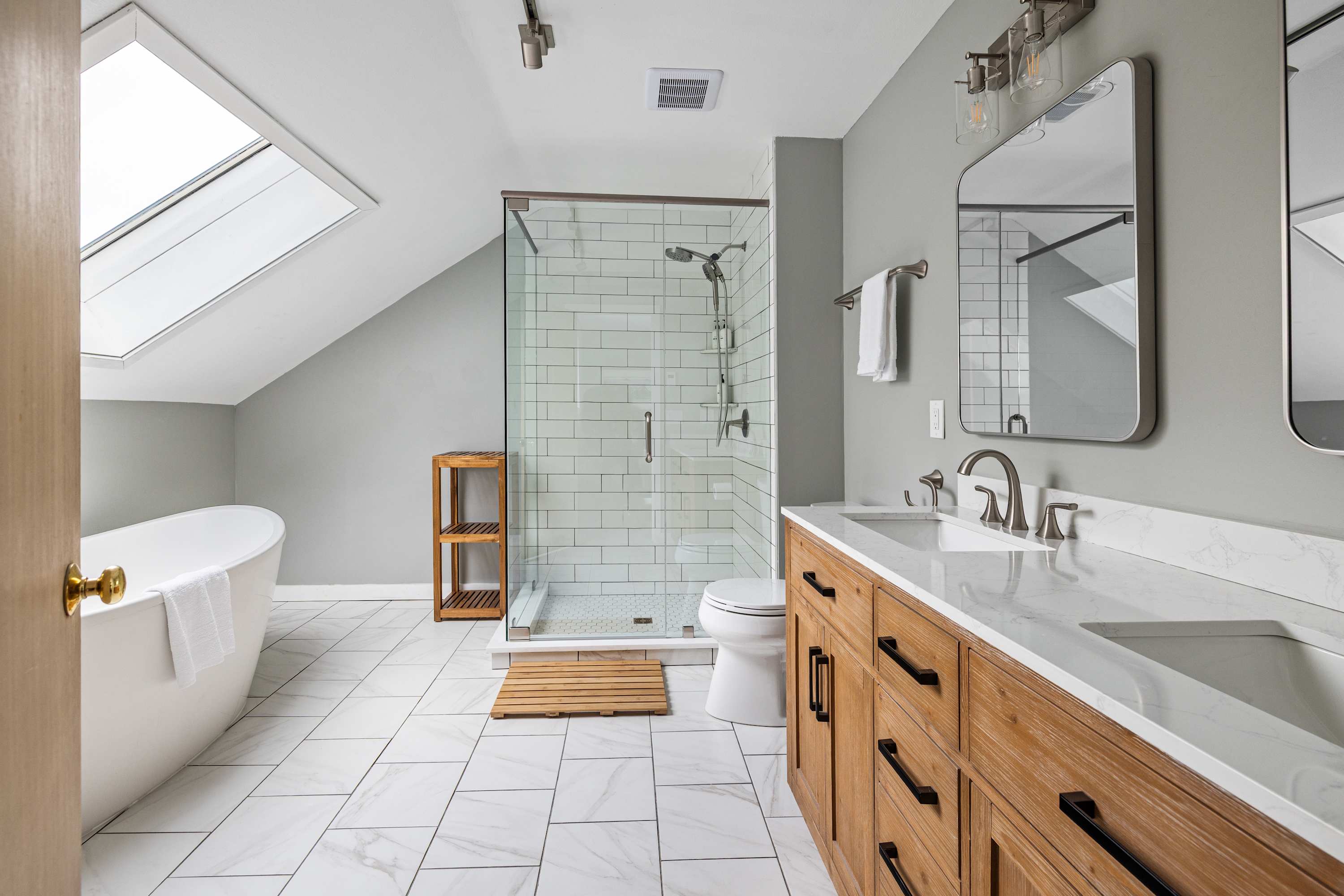 The top floor is dedicated to a private primary suite, featuring a queen bed, a full ensuite bathroom with glass shower and soaking tub, and a small private balcony. It’s a quiet retreat away from the main living areas.